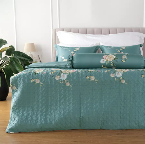 Thu hút ánh nhìn với tone màu xanh mát, bộ chăn ga bốn mùa này nhanh chóng chiếm cảm tình của người đối diện. Sự kết hợp của màu xanh ngát dịu nhẹ cùng các họa tiết hoa văn tinh tế, đơn giản mang đến vẻ đẹp dịu ngọt và năng lượng tươi mới cho căn phòng.