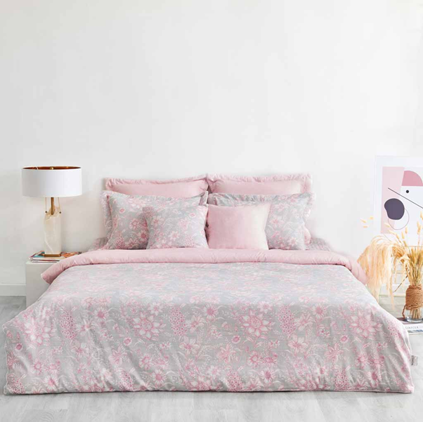 Bộ chăn ga gối đệm bốn mùa nền nã, kết hợp giữa họa tiết hoa văn với tông màu hồng pastel dịu dàng. Đây có thể xem là điểm nhấn đầy sự ngọt ngào cho không gian phòng của những cô nàng dịu dàng, hoặc các cặp vợ chồng mới cưới.