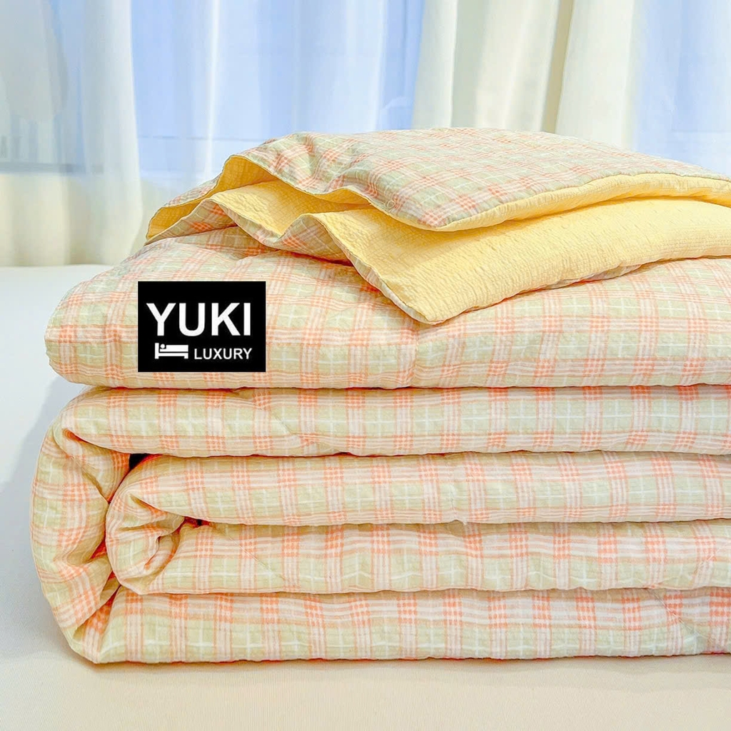 Chạm vào là cảm nhận ngay độ mềm – mịn – mát lạnh đúng chuẩn chăn Nhật cao cấp. Chất vải seersucker thoáng khí, nhẹ tênh, đắp lên không bí – không dính – càng nằm càng thích