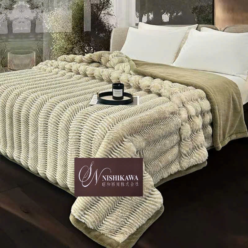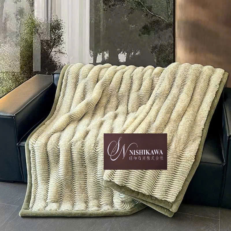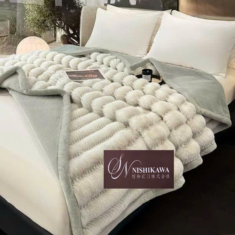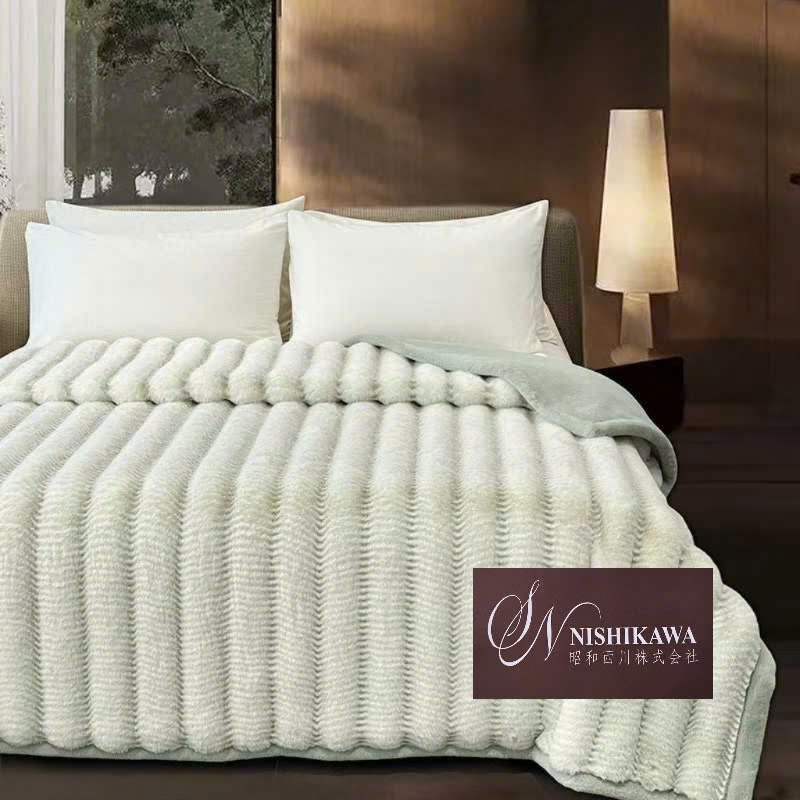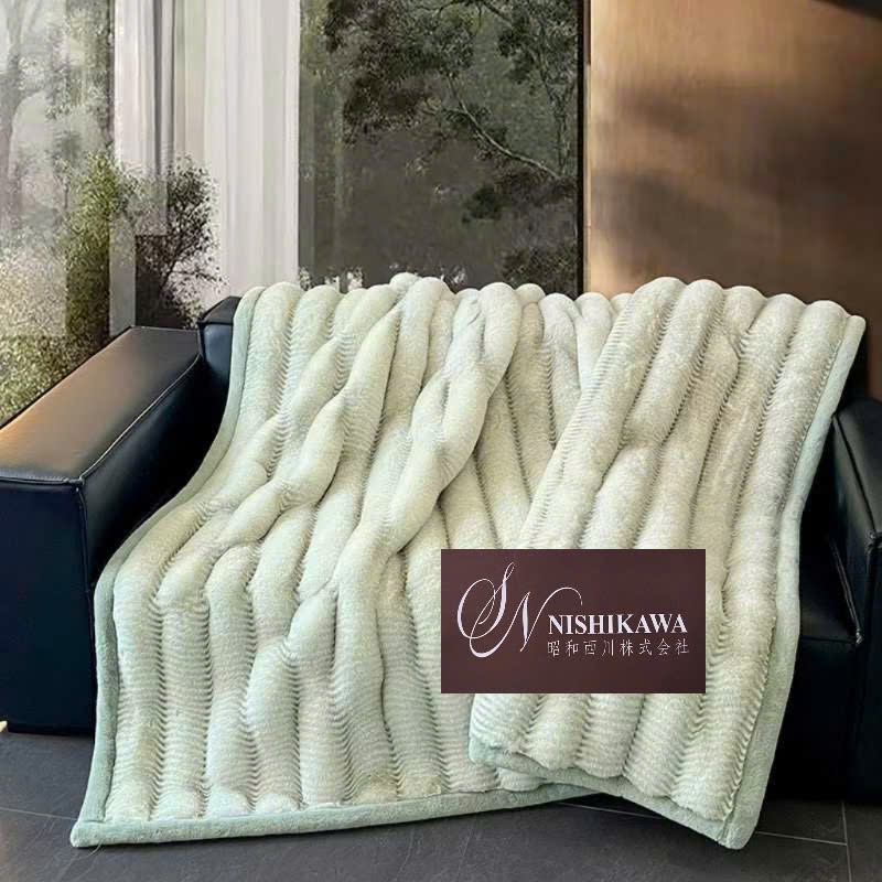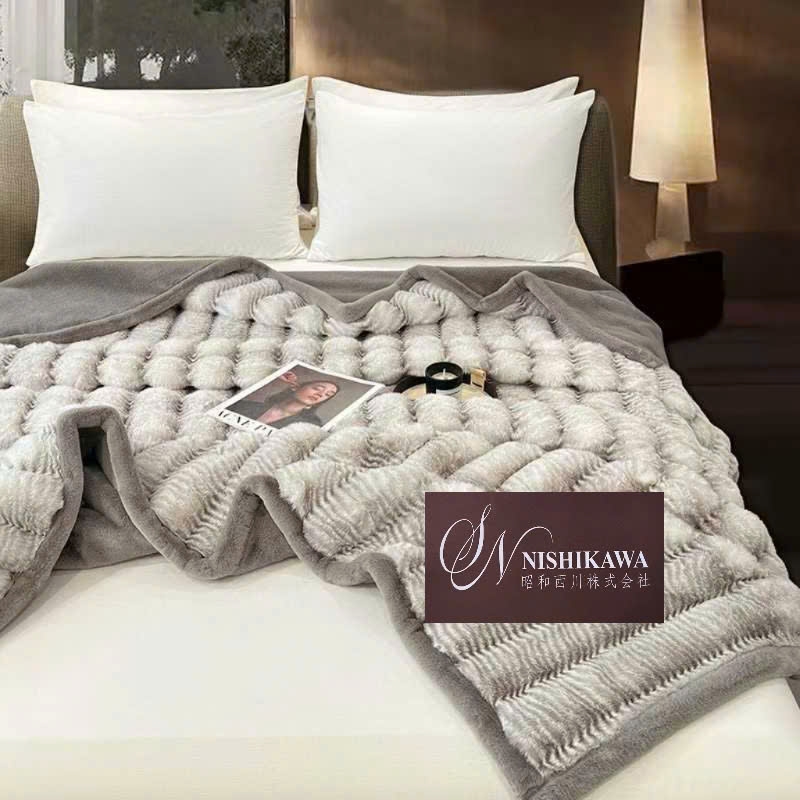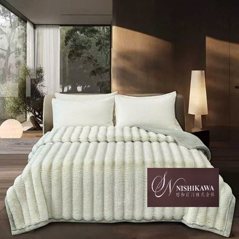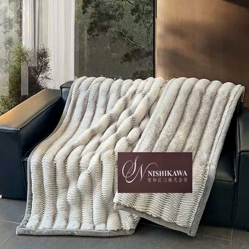 Bề mặt chăn được dệt nổi 3D dạng sóng ngọc mềm mại, tạo cảm giác sang như ánh ngọc dưới ánh đèn phòng ngủ. Mỗi đường gợn lông đều tơi mịn, đều đặn, mang đậm phong cách Nishikawa – tinh tế trong từng sợi chỉ.