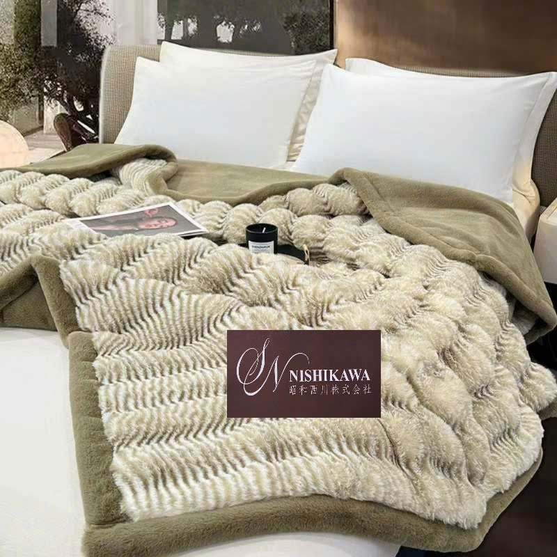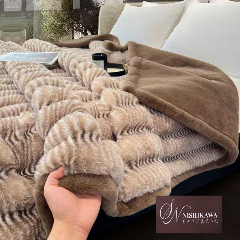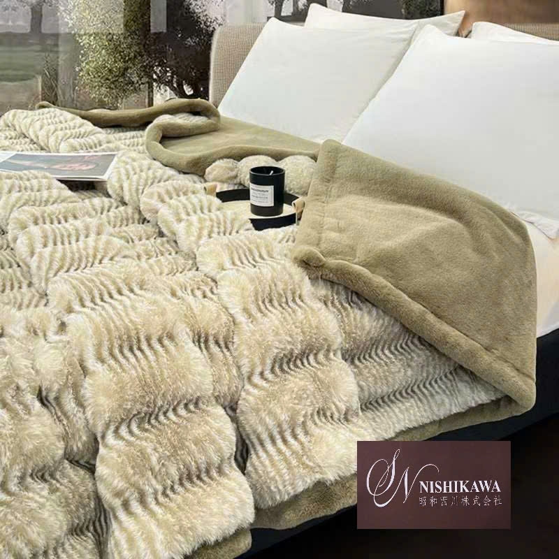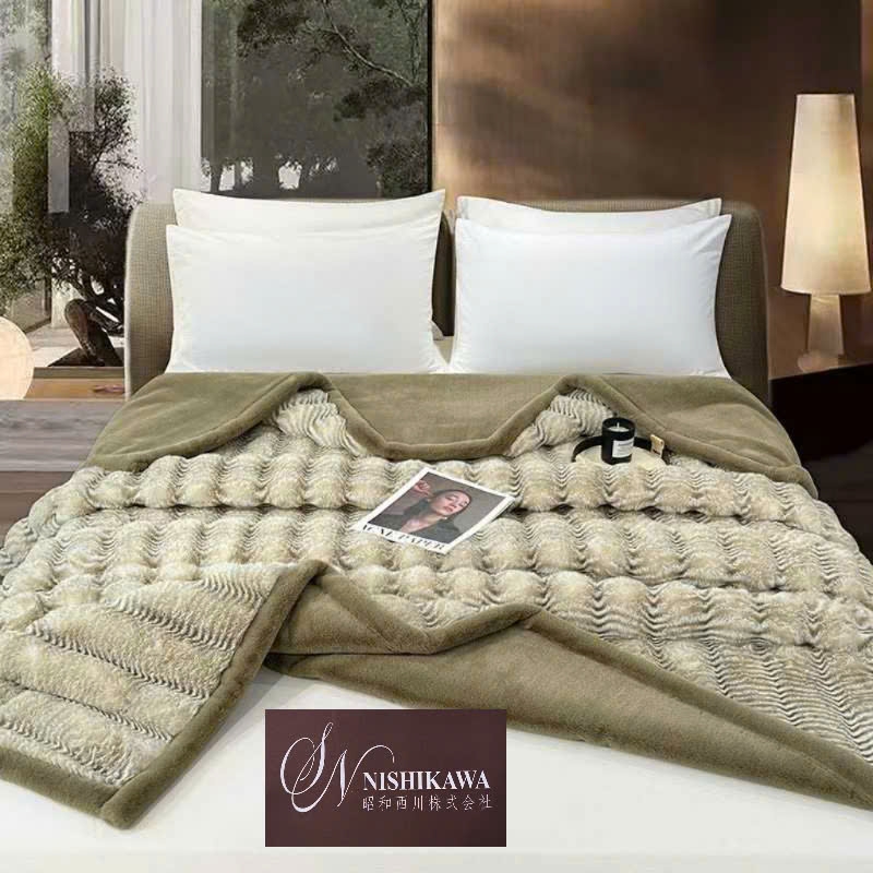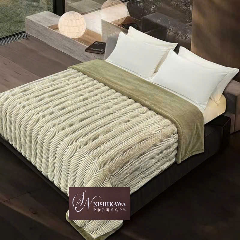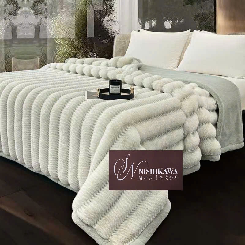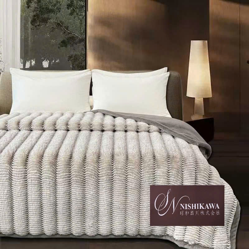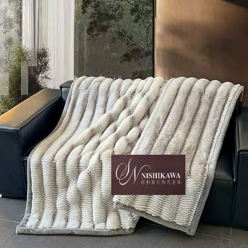 Bề mặt chăn được dệt nổi 3D dạng sóng ngọc mềm mại, tạo cảm giác sang như ánh ngọc dưới ánh đèn phòng ngủ. Mỗi đường gợn lông đều tơi mịn, đều đặn, mang đậm phong cách Nishikawa – tinh tế trong từng sợi chỉ.