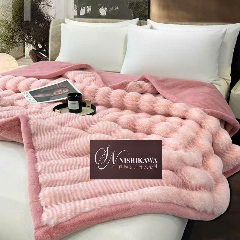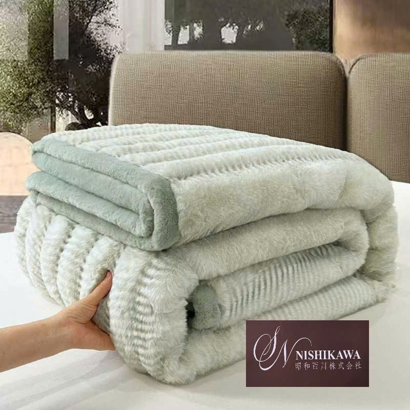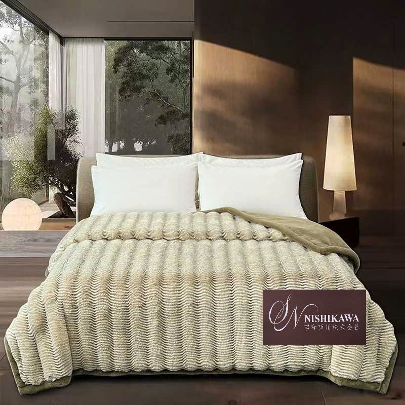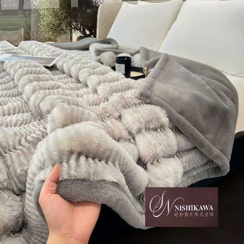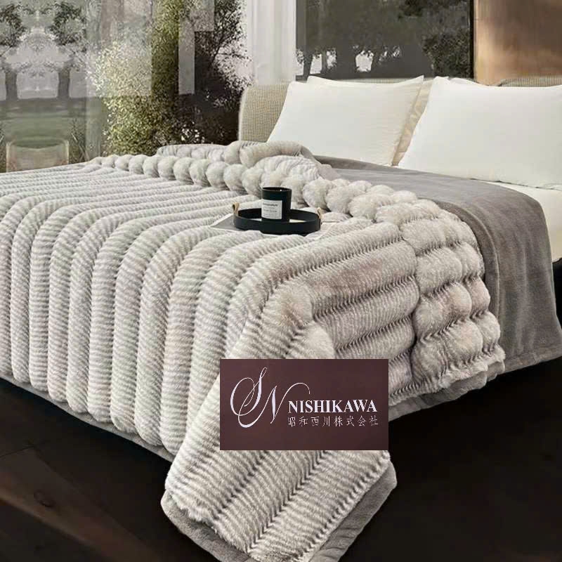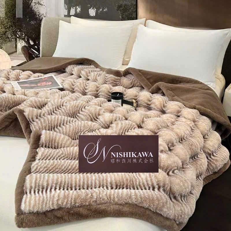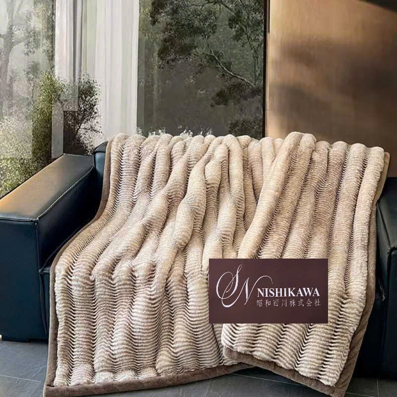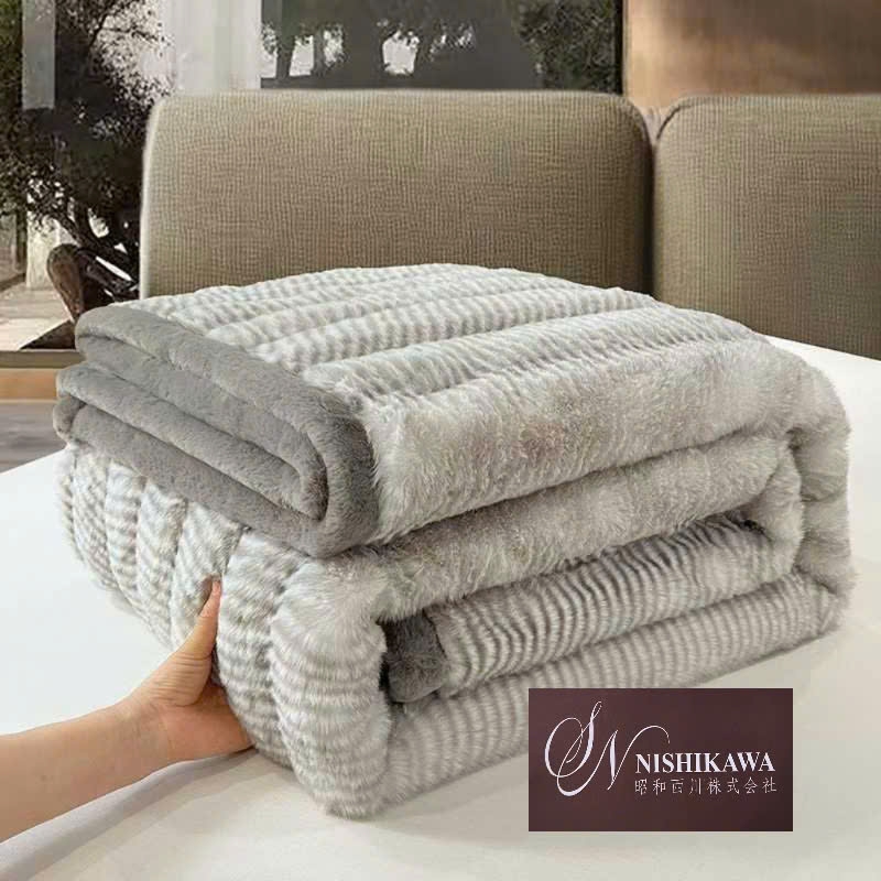 Bề mặt chăn được dệt nổi 3D dạng sóng ngọc mềm mại, tạo cảm giác sang như ánh ngọc dưới ánh đèn phòng ngủ. Mỗi đường gợn lông đều tơi mịn, đều đặn, mang đậm phong cách Nishikawa – tinh tế trong từng sợi chỉ.