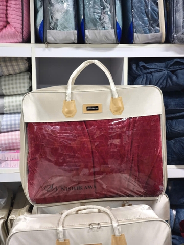- Túi xách đựng sản phẩm: Túi sử dụng để đựng chăn lông cừu có thương hiệu NISHIKAWA in nổi chữ 2 mặt, chất liệu Túi da màu vàng kim sang trọng
