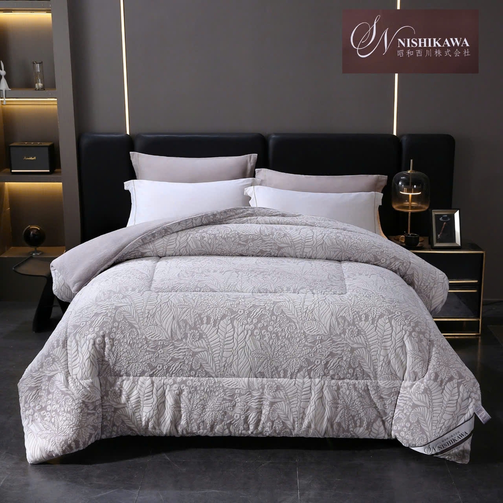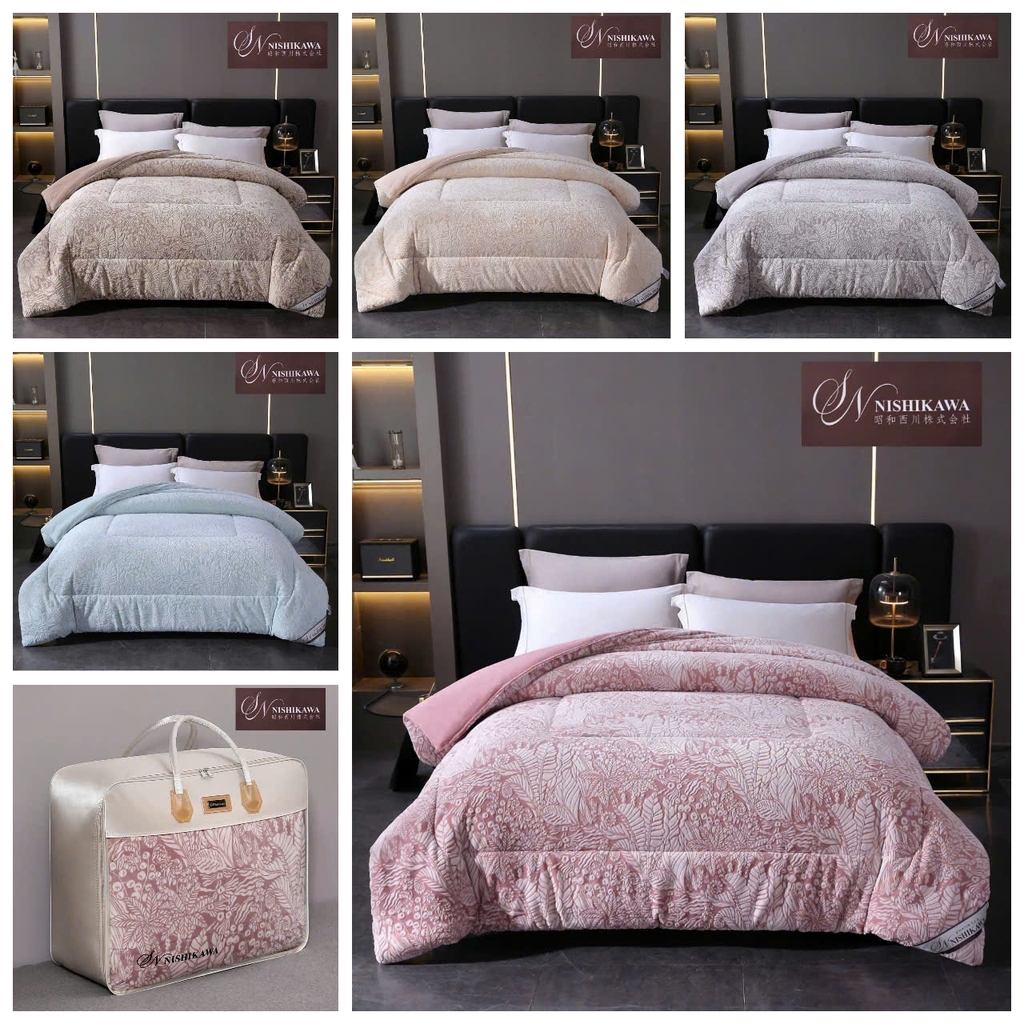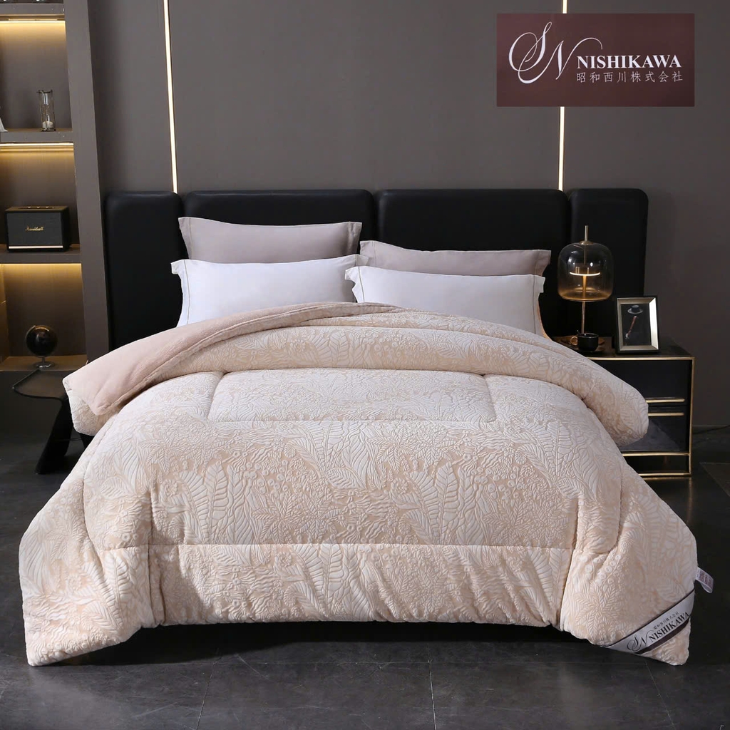 Chăn lông cừu Nhật CHANVRE trong bộ của sưu tập của hãng Nishikawa vẫn được sản xuất theo đúng tiêu chuẩn khắt khe trước đây, khi một mặt được làm bằng chất liệu lông cừu mềm mịn không bị tuột lông như các loại chăn lông cừu thông thường. Một mặt kia được làm bằng chất liệu nhung sữa nguyên chất đảm bảo ấm áp, mềm mại phù hợp với mọi lứa tuổi, thân thiện môi trường, dù nhiệt độ đại hàn vẫn có thể đảm bảo độ ấm tiêu chuẩn. Đặc biệt lông ở giữa làm từ sợi tơ tằm tự nhiên cao cấp... Nguyên liệu và chất lượng đẳng cấp từng centimet.