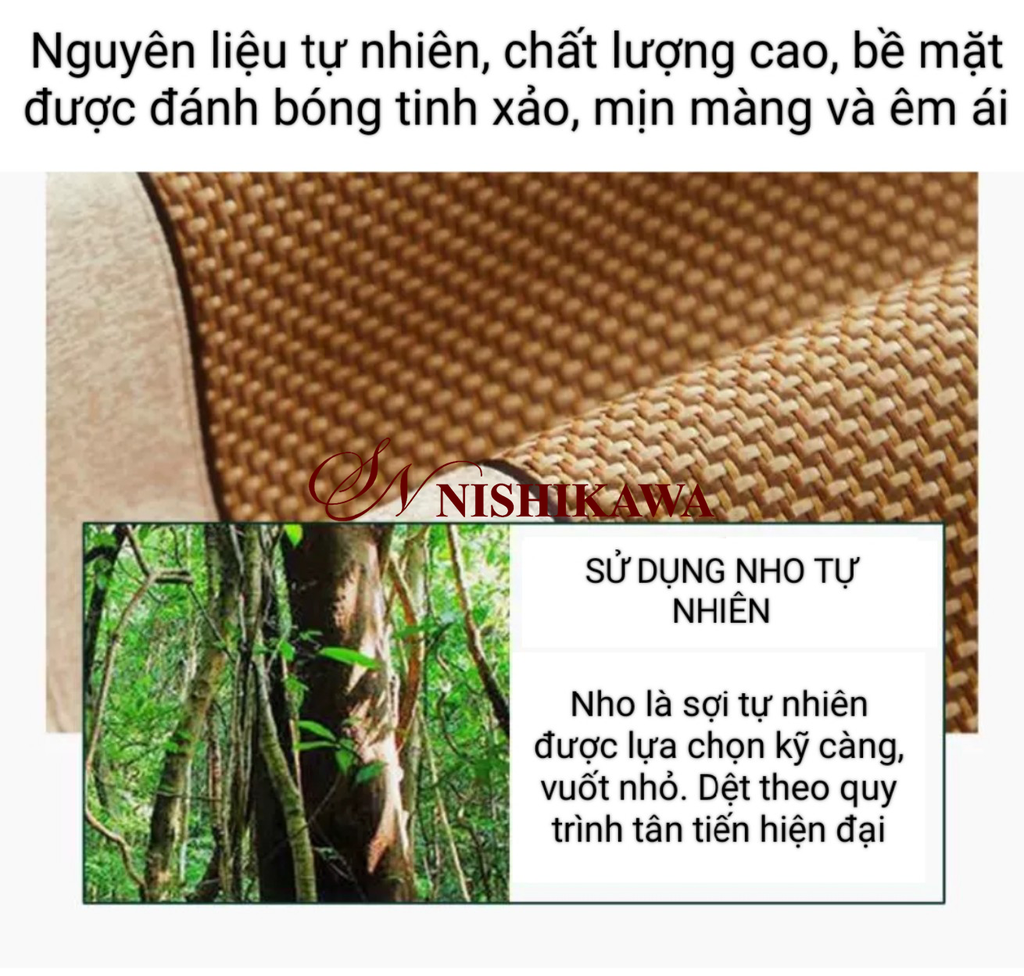 Chiếu cao cấp Nishikawa VIP PRO là dòng cao cấp là tự sợi Nho thiên nhiên. Với những nguyên liệu tự nhiên thân thiện với môi trường, được xử lý theo dây chuyền sản xuất hiện đại. Mẫu mã họa tiết đơn giản nhưng sang trọng, thông thoáng mát, và đặc biệt có mùi thơm tự nhiên rất dễ chịu.
