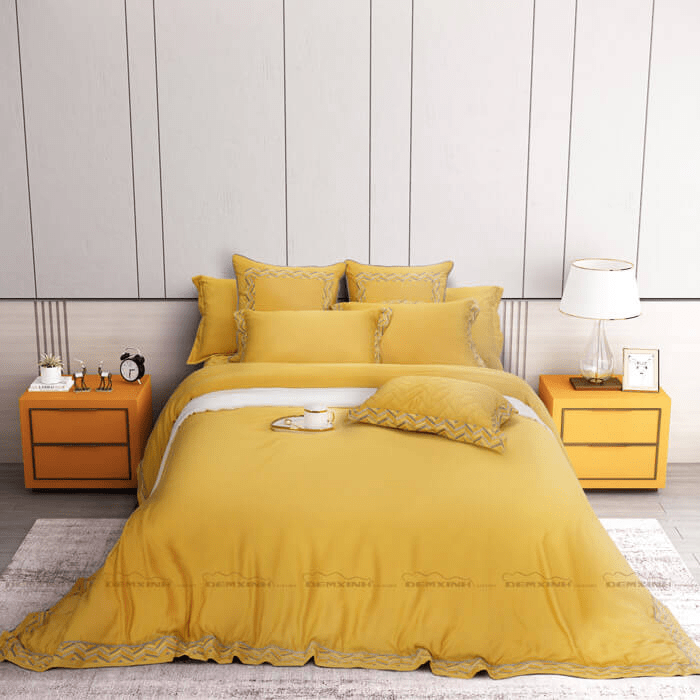 Bộ chăn ga gối đệm màu vàng dành cho gia chủ mệnh Kim